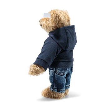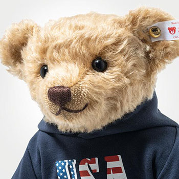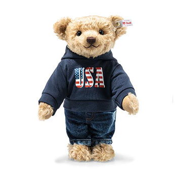 Meet the ninth addition to our “Great American Teddy bear” series: He’s a little boy bear who’s dressed to show his American pride. The Great American Bear is attired in an “unofficial” uniform which can be found in the wardrobe of almost every American: a classic pair of jeans and a comfortable hoodie. Naturally, the Teddy bear’s outfit appropriately features shades of red, white, and blue. He wears an intricately handmade pair of denim jeans that are inspired on a legendary style from the early 1900’s - a design that’s still popular today. Likewise, the Great American Teddy bear’s body style is a version of a 1909 Steiff design. He’s sewn from blonde mohair, and fully jointed. His feet are carded so he can stand - allowing him to proudly show off his hoodie. His shirt is emblazoned with the letters “USA”, with each letter showing the stars and stripes of the American Flag in the background. There’s no better way to celebrate the U.S.A. than with this iconically dressed patriotic Teddy bear.